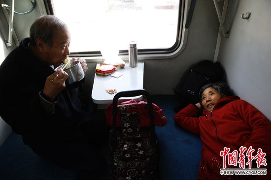 10月28日,北京北开往承德的4471次列车上,张连勤(左)吃着泡面,老伴儿李登莲躺在座位上休息。张连勤老家在河北承德,和老伴儿一起在北京昌平打工多年。他们平均两三个月回一次承德老家。