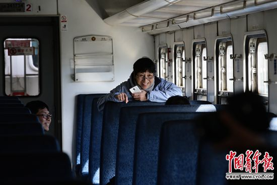 10月28日,北京北开往承德的4471次列车上,陈庆和同车的几位旅客交谈。陈庆说,自己从小在五道口附近长大,听说清华园车站快停用了,专门来看看,并坐这趟绿皮车怀旧。