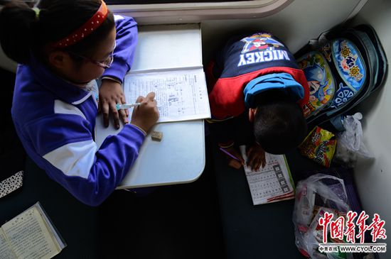 10月28日,承德开往北京北的4472次列车上,7岁的付则坤和姐姐付则英在车厢里写作业。爸爸带着他们姐弟俩去看在北京打工的妈妈。