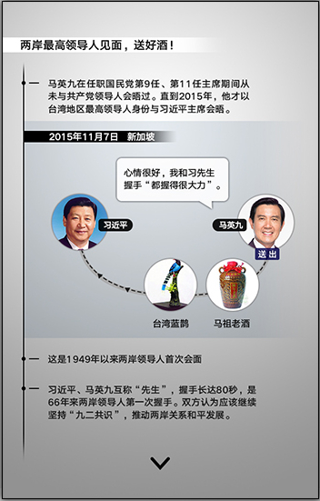 值得注意的是,国民党第9任、第11任主席马英九,在任职期间从未与共产党领导人会晤过。直到2015年11月7日,他才以台湾地区最高领导人身份与习近平主席会晤。这也是1949年以来两岸领导人首次会面。此次会面,习近平、马英九互称“先生”,握手长达80秒,是66年来两岸领导人第一次握手。马英九送给习近平主席的礼物是“台湾蓝鹊”和“马祖老酒”,请习近平主席品尝地道的台湾特色。