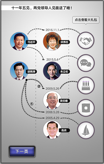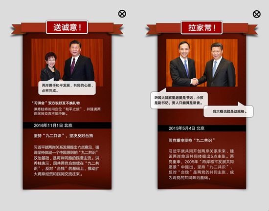 2015年国民党第13任主席朱立伦访问大陆,与中共中央总书记习近平会见,两人拉起了家常。而今年11月1日,中共中央总书记习近平会见了国民党主席洪秀柱。洪秀柱曾透露,双方说好互不换礼物。洪秀柱将访问定位“和平之旅”,并强调两岸民间交流不能中断。在会见中,洪秀柱表示,国共两党应继续在“九二共识”,反对“台独”的基础上,推动扩大两岸经贸和民间交流往来。可谓送出满满诚意。