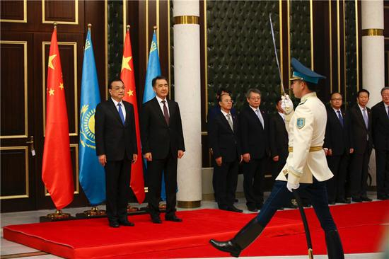 [哈萨克斯坦总理举 行隆重仪式欢迎李克强到访]共同出席上合组织总理会晤后,哈萨克斯坦总理萨金塔耶夫3日下午先行回国,在机场迎候随后抵达的李克强总理,并为李克强举行隆 重欢迎仪式。两国总理相互介绍双方主要官员后登上检阅台,军乐队先后奏响中哈两国国歌,李克强在萨金塔耶夫陪同下检阅仪仗队。