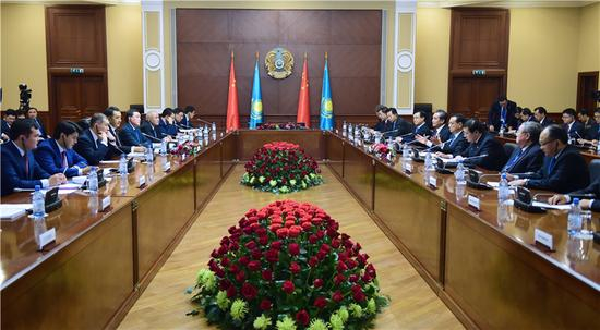 [李克强出席中哈总理第三次定期会晤]国务院总理李克强当地时间3日晚在阿斯塔纳总理府同萨金塔耶夫总理举行中哈总理第三次定期会晤。