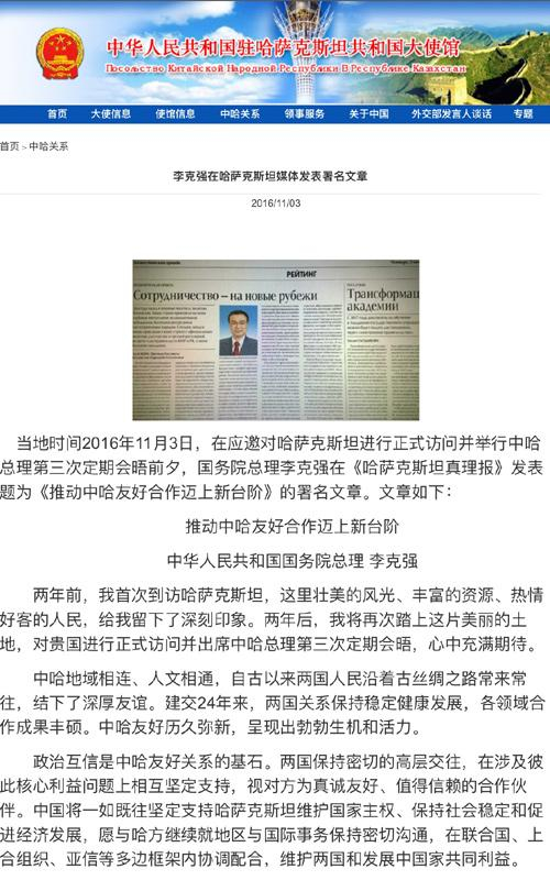 [李克强在哈最大报 纸发表署名文章]在访问哈萨克斯坦当天,李克强在哈最大报纸《哈萨克斯坦真理报》发表署名文章表示,产能合作是中哈合作中的一大亮点和重要增长点,中方愿 与哈方一道,本着开放、协商合作、互利共赢的原则,用实实在在的合作成果惠及两国人民,共同推动中哈友好合作不断迈上新台阶。
