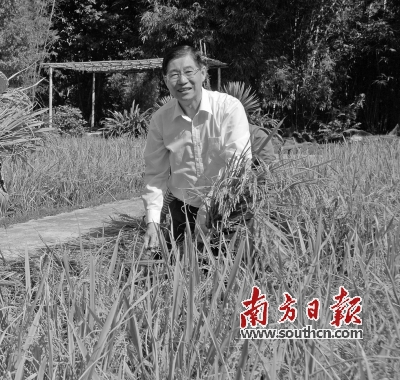 2011年,萧润君在中山故居农耕展示区割稻子。资料图片