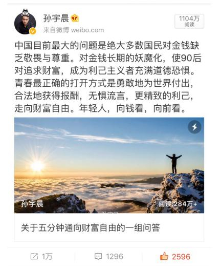 北京时间10月30日,著名90后创业者、陪我APP总裁兼CEO孙宇晨在新浪微博发表长文《关于五分钟通向财富自由的一组问答》,集中阐述他对财富自由的看法,大张旗鼓地呼吁90后不买房、不买车、不结婚的“三不主义”。文章发表不到72小时,微博阅读量已经突破1000万,迅速成为11月最火爆财经事件,黄章晋ster、艾力酷艾英语、英国报姐、思想聚焦等大V纷纷转发,引发了一场关于当代青年金钱观的大讨论。