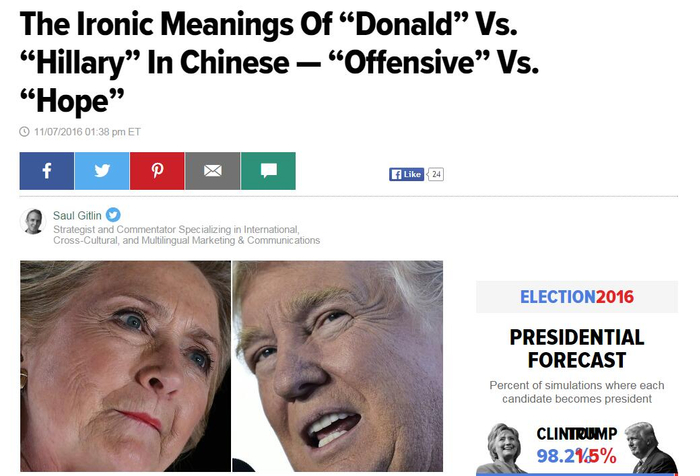 【环球网报道 记者 张骜】美国大选结果即将揭晓,媒体上不乏各式各样有关两位总统候选人的报道。甚至有美国专家试图用中文为特朗普和希拉里“测字”。11月7日,美国文化专家索尔•吉特林(Saul Gitlin)在《赫芬顿邮报》网站发表文章,题为《特朗普VS希拉里 中文名字的讽刺含义:冒犯VS希望》,希望借“充满智慧和远见的中国文化”预测大选。