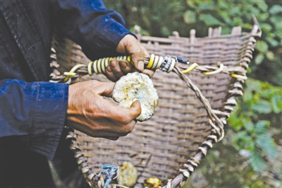 古蔺县古蔺镇枣林村,村民何克良在山上采摘的野生菌,当地人称之为“石灰菇”