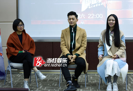 《一年级》总导演徐晴带着赵志伟、李莎旻子亮相看片会。