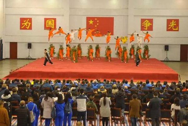 交流团师生一行首先在塔沟武校二号练功观看了两千人的武术训练课,随着一阵阵的习武呐喊声,来自意大利的两名队员也情不自禁地比划起来。随后,又在随同翻译的讲解下,观看了塔沟武校的历史展览馆,对该校建校38年来的发展历程做了详细的了解,特别是意大利的团队在看到南京青奥会《筑梦之塔》节目照片时,都赞叹不已并竖起了大拇指。最吸引人的,当属塔沟武校武术艺术表演团学员进行的武术专场演出,《少林雄风》、《中国龙》和登上中央电视台2014年春节联欢晚会的《少年中国》节目,等脍炙人口,主题鲜明;而《少林硬气功》中的金钟罩、头开钢板、二指禅、单指碎碗、针穿玻璃、腹部吸碗则让两百余名师生在屏住呼吸、心跳加速的同时,目瞪口呆,大呼过瘾。