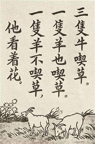 他首先贴出了开明国语课本中的课文《三只牛吃草》。“三只牛吃草。一只羊也吃草。一只羊不吃草,他看着花。”文中的插图上,一只羊正在低头吃草,另一只痴痴地赏花。黄伟教授解析中,寥寥几句的《三只牛吃草》有着丰富的意境:“生活不仅是当下的苟且,还有诗意和远方。”记者查阅资料获悉,1932年上海开明书店出版了一部初等小学用的国语课本,被称为“开明国语课本”,共八册。叶圣陶(绍钧)先生写的课文,丰子恺先生绘的插图。课本上市后受到了教育界的普遍赞誉。拿来与《三只牛吃草》对比的是苏教版小学语文第二册中的《蘑菇该奖给谁》。这是有趣的童话故事:清晨,兔妈妈出门采蘑菇,临走时嘱咐两个孩子要好好练习跑步。晚上回家后,兔妈妈奖励了没有跑得过骏马的小白兔,因为它敢和高手比赛。赢过乌龟的小黑兔没有得到奖励。虽然故事生动有趣、语言丰富,黄伟教授认为文章传递的思想有点功利,“从学步开始,就意味着激烈的竞争和功利的追求。”