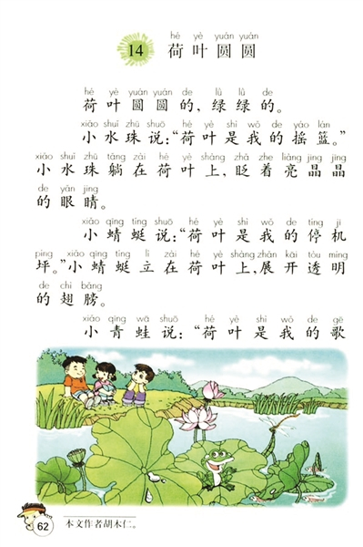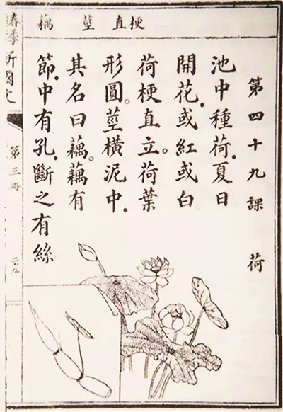 《荷》这篇课文摘自庄俞、沈颐主编的《共和国教科书新国文》初小第三册,由商务印书馆1912年出版。“池中种荷夏日开花。或红或白荷梗直立。荷叶形圆。茎横泥中。其名曰藕。藕有节。中有孔。断之有丝。”黄伟教授解析道,简短的文字描述了荷花、荷叶、藕的形态,让孩子们掌握了基本的知识,字里行间透出了生命的质感与底蕴。我们的小学课本中也有荷叶主题的文章。比如苏教版小学语文第四册中的《真想变成大大的荷叶》,人教版小学语文一年级下册《荷叶圆圆》。 比如《真想变成大大的荷叶》一文中,“荷叶像一把大伞,静静地在荷塘里举着。”文字优美、抒情富有想象力,重点在“童趣”。