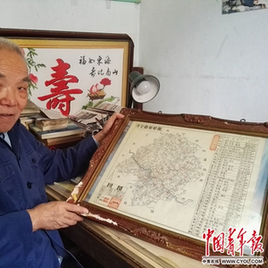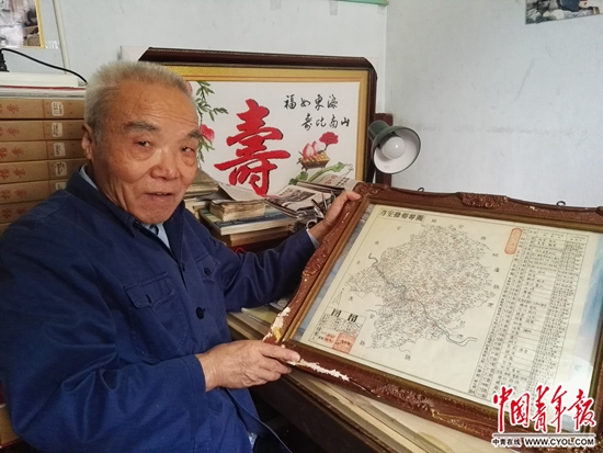 余年春和他手绘的淳安老县地图。中国青年报·中青在线记者 蒋欣/摄