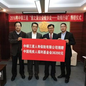 2016年11月10日,中银三星人寿“爱之翼”助残健步走捐赠仪式在北京中国残疾人福利基金会举行。中国残疾人福利基金会副秘书长朱晓峰、中银三星人寿执行董事金一权、中银三星人寿业务服务部副总经理徐伟等嘉宾出席了本次活动。