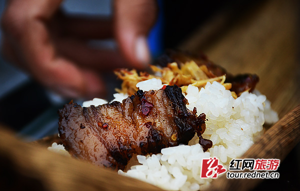 在美食宴上,来自附近团寨的村民比拼厨艺。这位老乡正用糯米、腊肉和笋丝制作“红军饭”。通道是红军长征时转兵之地,红色文化不仅存留在博物馆里,也体现在老百姓的生活中。