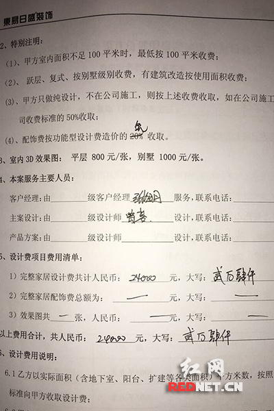 今年9月,何先生来到位于韶山南路的东易日盛国际家居设计馆,委托公司给自家一套200平的房子做装修设计。在与一位副主任级别的设计师谈定签约后,何先生预付了24000元的设计费。