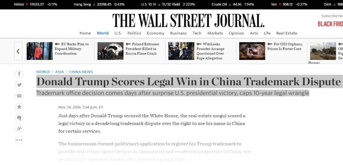 《华尔街日报》报道标题:特朗普在中国的商标纠纷中获胜。