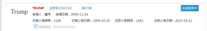 据她介绍,虽然法院于2015年裁定特朗普败诉,但裁决后,律所还在继续就商标的使用权进行争取,并向工商局提出了商标无效申请,所以周丹丹称目前董伟虽然获得了“TRUMP”的注册权,但仅限于在钻井、采矿领域使用,而商标注册 第37类(主要包括房屋建筑,修理,安装服务)中的其他用途,则归“ 特朗普总统”所有。