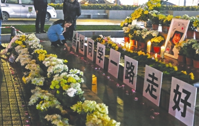 昨晚9点的广场上,仍不断有人手捧菊花前来。人们三五成群,回忆着余旭的家庭和她如何为家乡争了光。