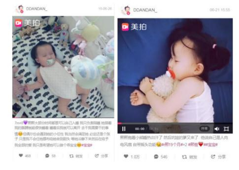 作为代表用户之一,美拍用户“DDANDAN_”对于美拍的运用便是一个很好的例子。这个美拍账号是用户本人专为记录女儿熙熙而创建的,由父母两人共同运营。女儿于2014年11月出生,至今两年时间,夫妻两人坚持使用美拍视频记录女儿的每一天,已经创建了1597个美拍视频,获赞626万次。女儿熙熙从被人抱在怀里只会睡觉的模样,到如今能跑能跳能笑能说话,一点一滴的成长、与家人朋友的互动都被记录在美拍镜头之中。