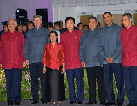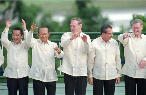 1996年APEC会议来到了东南亚,东道主菲律宾为与会领导人准备了“巴隆他加禄”:由菠萝纤维手工编织制成,是一种丝质紧身衬衣,长可及臀,前领口直到下襟两侧,都有抽丝镂空图案,花纹各异,颇为大方。