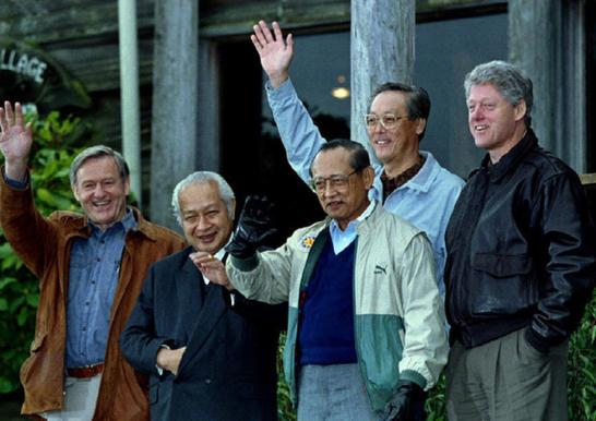 1993年,首次APEC领导人非正式会议在美国西雅图召开。会议一开始就决定以非正式形式进行:不设主题,领导人不带助手,自由交谈,服装当然也没有主题。当时,美国总统克林顿就穿着牛仔裤,颇具美国特色。