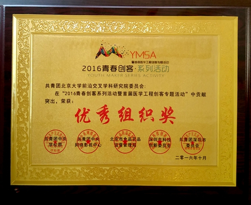由共青团中央学校部、共青团中央网络影视中心、北京市食品药品监督管理局共同举办的“2016青春创客系列活动暨首届医学工程创客专题活动”于近日圆满落幕。北京大学前沿交叉学科研究院共有三支团队参与角逐,其中一支进入总决赛并喜获三等奖。前沿交叉学科研究院团委同时荣获“优秀组织奖”。