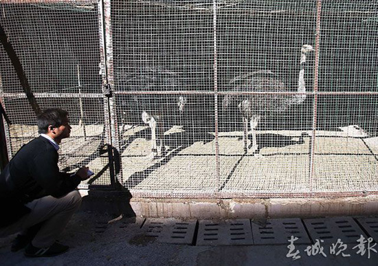 25日中午,记者在昆明永丰村一大型购物中心附近找到这个“动物园”,里面有鸵鸟、羊驼等动物。4只羊驼被关在一排铁笼里,两只白色两只棕红色。鸵鸟阵容更庞大,共7只,分别关在两个笼舍,见有人来就将嘴伸出想要东西吃。但是,铁笼有两层,它们的嘴伸不到外面。