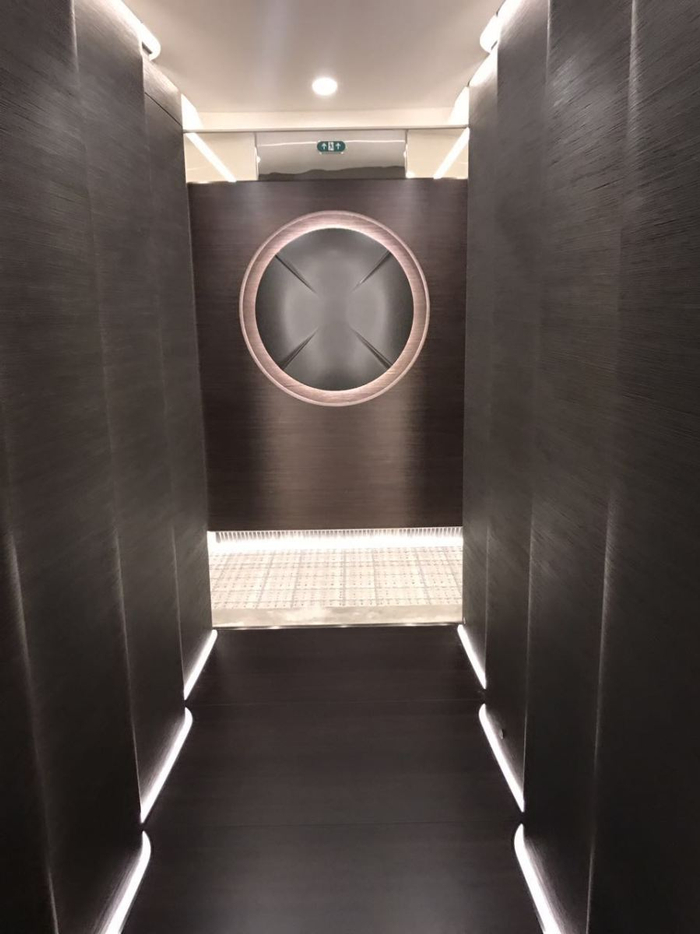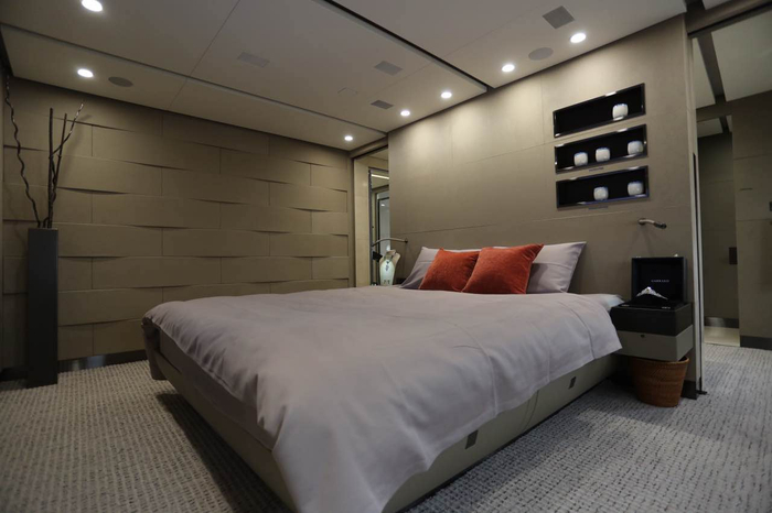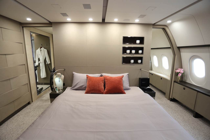 改装好的飞机内部面积有220平米,设置了独立的机组工作区、隔音的主宾休息区、以及客厅娱乐区和亲友休息区,配有卧室、浴室、更衣室、会议室等设施,还有18个全平躺头等舱座位(材质比客机头等舱要好的多,但却是这架公务机上最“简朴”的部分,往后看你就知道为什么这么说了)。