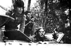 美国中情局策划并发动了“猪湾行动”,支持古巴雇佣军登陆猪湾,企图以武力推翻卡斯特罗领导的古巴革命政权。图为卡斯特罗在猪湾附近的坦克里指挥战斗。