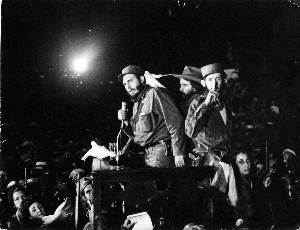 卡斯特罗率领着革命队伍推翻了巴蒂斯塔军事独裁政权,建立革命政府,并出任政府总理(后改称部长会议主席)和武装部队总司令。图为革命取得胜利,卡斯特罗向支持者发表演讲。