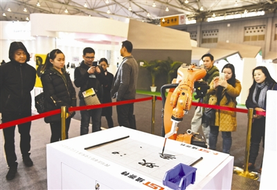 11月25日,成都市民观看展馆中写毛笔字的机器人摄影记者 张士博