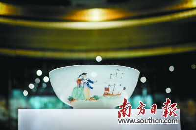 “广彩洋人远航图大碗”产于清代乾隆时期,是外国商船抵达广州后专门制作的纪念品。大碗的中心有“亲爱的伊丽莎白”和“1757”航海年号标识。