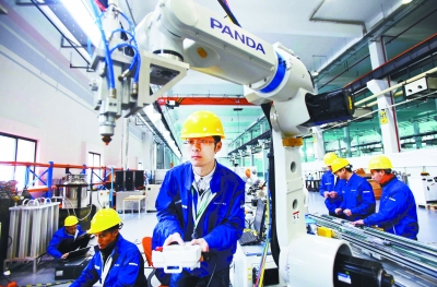 这是熊猫电子装备有限公司繁忙的机器人生产线。本报记者 吴彬摄