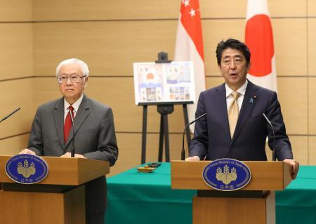 日本首相安倍晋三与新加坡总统陈庆炎举行联合记者会。【环球网报道 记者 王欢】日本首相安倍晋三12月1日与新加坡总统陈庆炎在官邸举行会谈,双方确认将为使跨太平洋伙伴关系协定(TPP)生效而共同努力。安倍还表示,希望在连接该国与马来西亚的高铁计划中采用日本新干线方式。