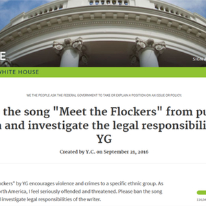 【环球网报道 记者 张骜】自9月21日以来,全美各地华人在白宫请愿网站发起请愿,要求禁止播放煽动抢劫华裔的嘻哈歌曲《遇见劫匪》(Meet the Flockers)。12月1日,该请愿的签名人数超过11万,白宫方面发表声明回应说,宪法第一修正案保护言论自由,白宫并不就特定歌曲是否在公众中传播做出决定。
