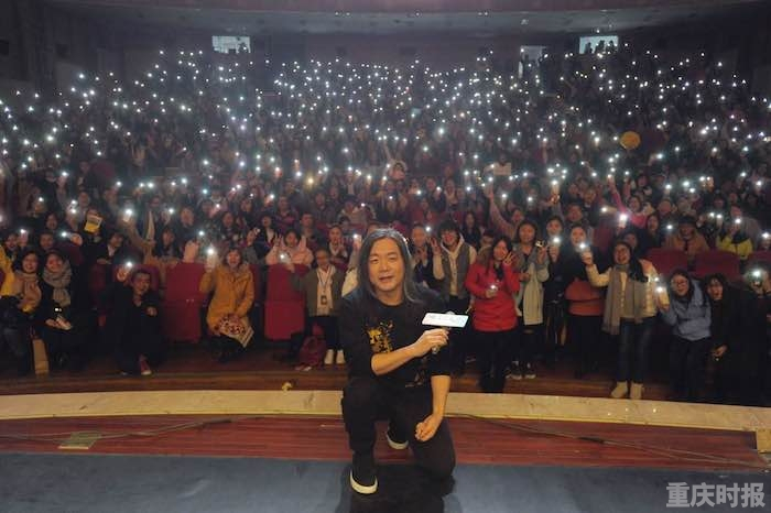 将于12月23日上映的《摆渡人》是张嘉佳首部电影导演作品,影片的阵容实在是闪瞎眼,王家卫监制,梁朝伟、金城武、陈奕迅、Angelababy、鹿晗、张榕容、杜鹃、熊黛林、大鹏、马苏、崔志佳、贾玲……可谓是集合了当下最热门的明星。12月1日,张嘉佳只身一人来到重庆师范大学为自己的新片吆喝,虽然没有大明星相伴,但同学们也没有冷落他,有大批的书迷都拿着他的书到现场找他签名,让张嘉佳感受了一把重庆粉丝的热情。