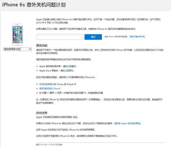 12月2日消息,苹果公司今日在其官网推出了一个序列号查询工具,便于人们自助查询自己的iPhone 6s电池是不是在可免费更换范围内。此前有不少iPhone用户发现自己的手机会自动关机,而苹果官方称,“此问题仅会影响序列号在一定范围内的,生产日期为2015年9月到10月之间的设备”。