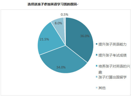 调查数据反映,对于多数父母,送孩子参加课外英语学习的主要目的集中在两方面:第一是“提升孩子的英语学习能力”,占36%;第二是“提升孩子的英语考试成绩”,占34%。这说明,在孩子的英语学习上,家长对于成绩与能力同等重视。其中,英语能力是指听说读写的综合能力。还有8%的家长是为孩子日后留学早作打算。