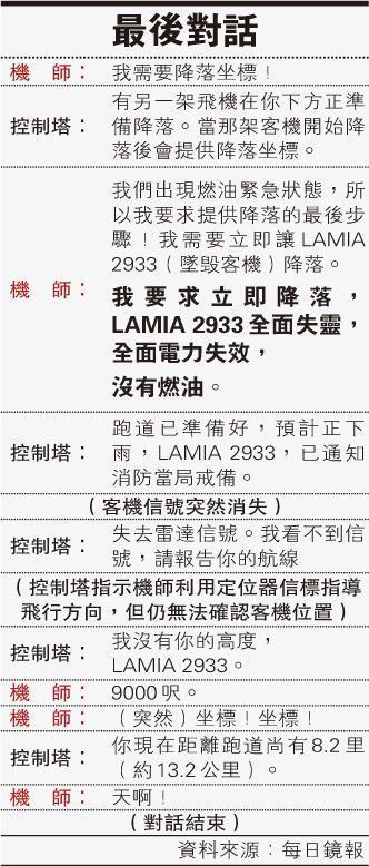 之后这架玻利维亚拉米亚航空公司的包机开始在空中盘旋,机长也越来越绝望。就在上述录音对话后,飞机开始了4分钟的死亡盘旋,最终撞向山坡。