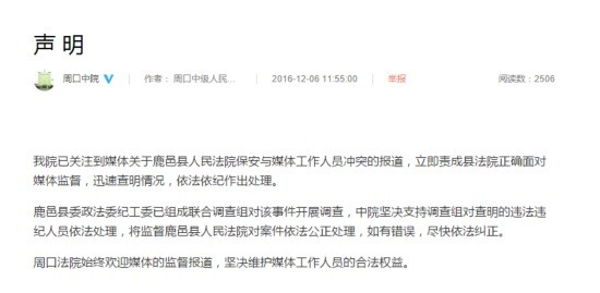 鹿邑县委政法委的通报显示,12月5日上午9时29分,河南电视台都市频道两名记者在法院大门口拍摄,在门岗值班的鹿邑县法院法警大队队长张诚为维持门岗秩序,就不让记者再拍,因未能有效制止,就让值班保安前去阻止。9时36分,值班保安在阻止记者拍摄过程中,与记者争夺摄像机,将摄像机目镜损坏,另一名记者用手机继续拍摄,保安发现后,将该记者的手机收走。