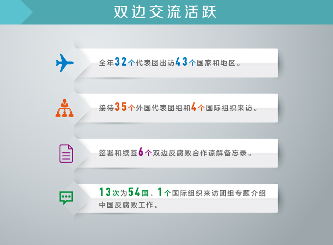 反腐败国际合作的中国声音越来越宏亮、中国故事越来越精彩。从2014年北京APEC峰会通过《北京反腐败宣言》,到2016年G20杭州峰会通过《二十国集团反腐败追逃追赃高级原则》《二十国集团2017-2018年反腐败行动计划》,在华设立G20反腐败追逃追赃研究中心;从2016年组织32个代表团出访43个国家和地区、接待35个外国代表团组和4个国际组织来访,到签署和续签6个双边反腐败合作谅解备忘录、13次为54国1个国际组织来访团组专题介绍中国反腐败工作,中国的主张越来越被国际社会倾听,拒绝腐败分子入境、追缴和归还腐败资产越来越成为国际反腐败合作的重要议题。
