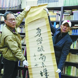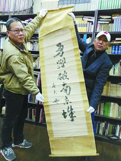 余戈(左)和吴先斌(右)在展示谷寿夫书写的条幅。本报记者吕宁丰摄