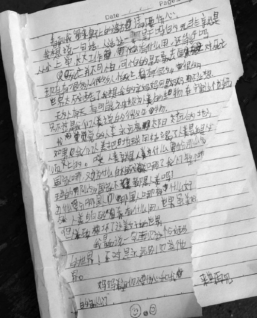 记者看到,遗书写在一个日记本上,约有300字。日记本的前几页已经撕掉,写有遗书的那一页也缺了一个角。遗书上写着“看到我留来(在)桌子上的遗书请不要伤心……”“世界太残酷了,我想我的亲妈妈……”“妈妈希望你不要伤心和我的家人们……”应该是写得非常匆忙,文章不太通顺,字迹潦草,并有多处涂改,但看过之后,孩子真实的内心表达让人非常难受。