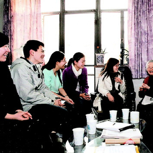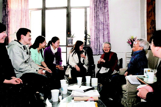 杨绛在家接待清华“好读书奖学金”获奖同学,她说话幽默,逗得大家直乐。(据吴学昭著《听杨绛谈往事》)□吴学昭