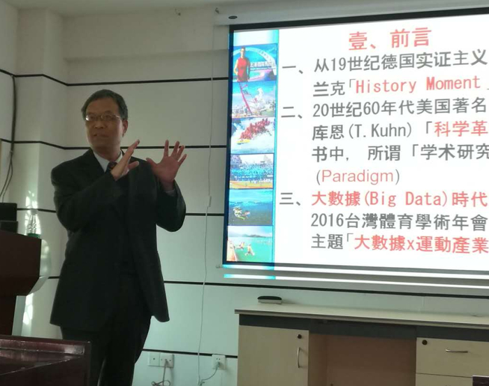 日前,台湾体育运动史学会会长、东北亚体育运动史学会副会长、高雄树德科技大学王建台教授一行来我校访问交流,应邀作了题为“近年台湾体育学术研究的热点与对话”和“体育人文社会科学的研究方法论”的两场学术报告。