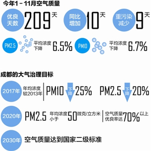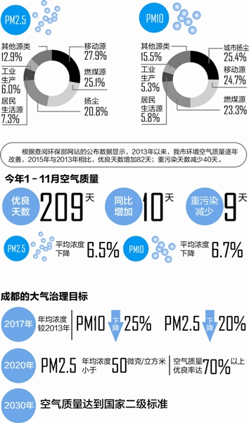 张正红表示,下一步,成都还将下大力抓好大气污染防治,实施“减排、压煤、抑尘、治车、控秸”五大工程。一是通过严管各类施工工地、渣土运输等措施抓好扬尘污染减排;二是通过严格新车入户管理、提升油品质量、严格尾气排放检测、加快淘汰黄标车和老旧车等措施抓好机动车排气污染减排;三是通过对重点行业企业深度治理抓好工业企业污染减排;四是通过严查禁燃区燃煤污染、限时完成禁燃区内燃煤锅炉淘汰、禁燃区外燃煤锅炉清洁能源替代等措施抓好燃煤污染减排;五是通过整治露天焚烧、违法燃放等,抓好露天焚烧污染减排。