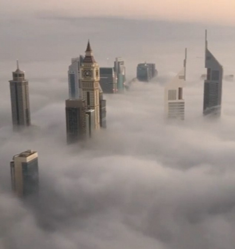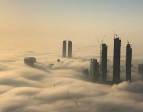 迪拜王子摩天大楼拍摄云中城:阳光微醺 雾霭缭绕