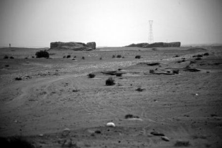 买力克阿瓦提古城位于和田市郊城东南25公里处,开车经过和田机场后,在一个十字路口处往右拐,进入一条乡村土路,沿着军事禁区的围墙直直往前走,围墙尽头处再右拐,穿过一个村庄,一直走到底就是古城遗址了。整个古城遗址都用铁丝网包围起来了,大门紧锁。不过看门人就住在门口,我们叫了半天才出来。古城遗址南面昆仑山云吞雾绕,影影绰绰,西侧沙山环立,冈峦起伏,南北长十公里,东西宽两公里,据说早年尚有内外皆为方形的二重城墙残迹,现已不存,仅留下许多高大的土堆和建筑用的柱础以及陶窖堆积。出土文物有铜佛像、玉器、泥塑佛像残件、回纹图案墙饰、壁画残片、陶器和大量古钱币。钱中有汉代五铢钱、魏晋南北时代的剪轮钱。