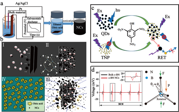 (a)纳米晶制备技术路线图;(b)纳米晶制备原理图;(c)硫化钨纳米晶检测三硝基苯酚原理图;(d)立方氮化硼纳米晶压电输出及压电产生原理图